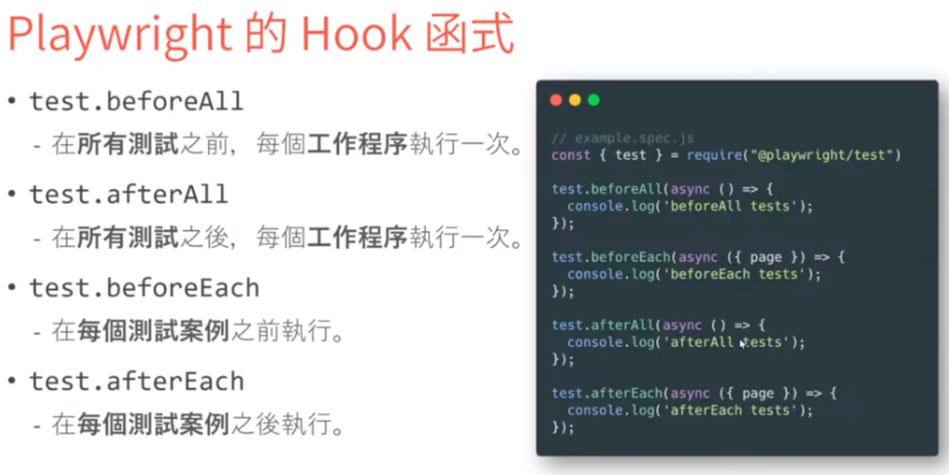 - 單元測試:以 function 為單位做測試